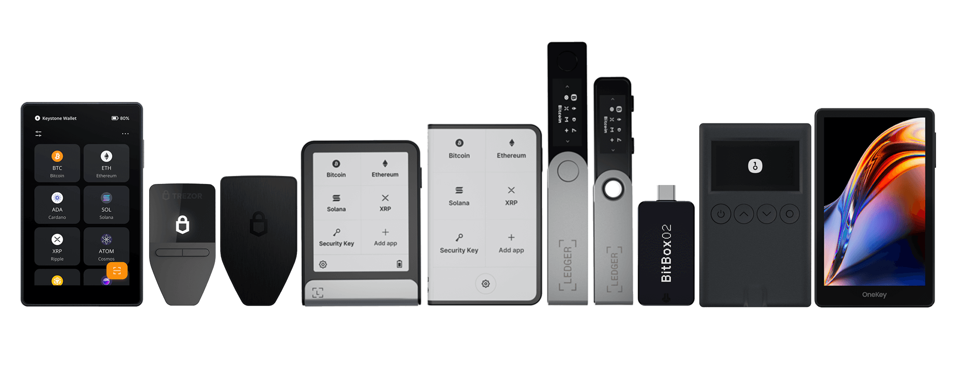 | Trezor Safe 5 | Trezor Safe 7 | Keystone 3 Pro | Ledger Nano Gen5 | Ledger Flex | Ledger Stax | OneKey Pro | |